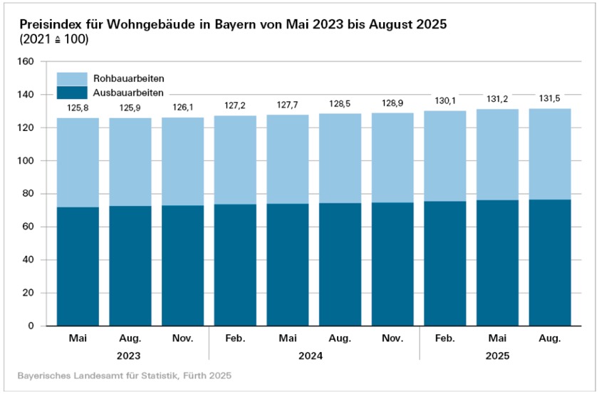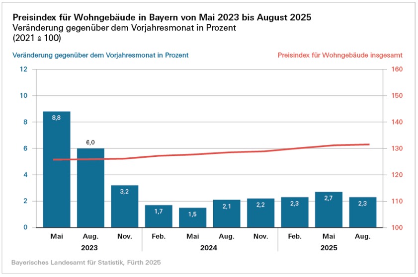 Binnen Jahresfrist sind also im August dieses Jahres die Preise für den Neubau von Wohngebäuden im Freistaat um durchschnittlich 2,3 Prozent gestiegen. Im Mai heuer hatte die Steigerungsrate im Vergleich zum Vorjahres-Monat bei 2,7 Prozent gelegen. "Nach der sehr dynamischen Preisentwicklung, die seit Mitte 2022 mit Preissprüngen von über 17 Prozent zu beobachten war, stabilisierten sich die Preise seit 2024 auf vergleichsweise hohem Niveau", fasst das Landesamt für Statistik zusammen.