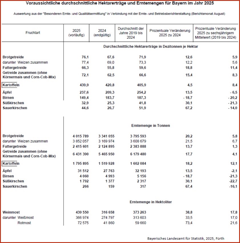 Aktuellste Informationen des bayerischen Landesamts für Statistik zu den erwarteten Erträgen, auch bei Äpfeln, Birnen und Kirschen.