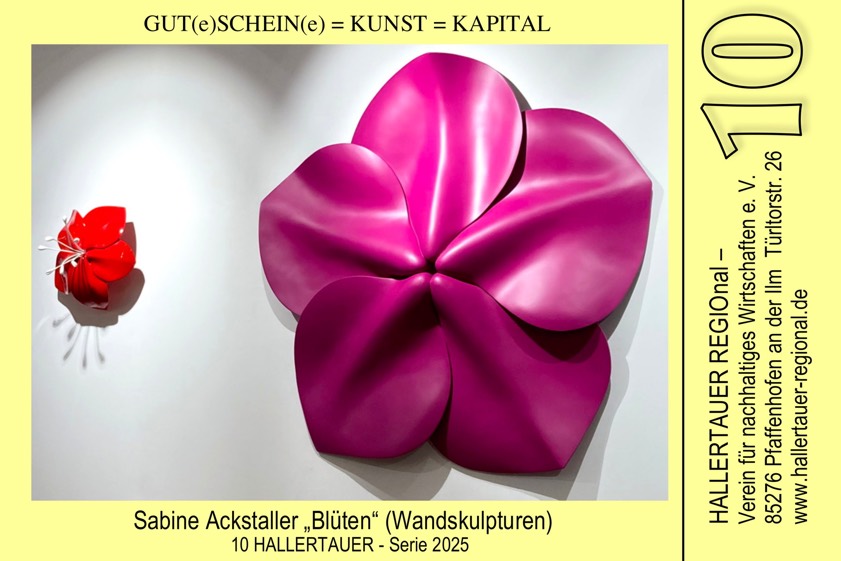 Die "Hallertauer"-Ausstellung kann dann bis zum 16. November während der Öffnungszeiten der städtischen Galerie bei freiem Eintritt besichtigt werden. Die Öffnungszeiten lauten: montags bis donnerstags jeweils von 13.30 Uhr bis 17 Uhr, dienstags und freitags jeweils von 9 Uhr bis 12 Uhr sowie samstags, sonntags und an Feiertagen jeweils von 11 Uhr bis 17 Uhr. Alle acht Künstlerinnen und Künstler, die die Scheine der aktuellen "Hallertauer"-Regionalgeld-Serie gestaltet haben, haben einen Bezug zu Pfaffenhofen, betont der Verein und erklärt dazu kurz folgendes: