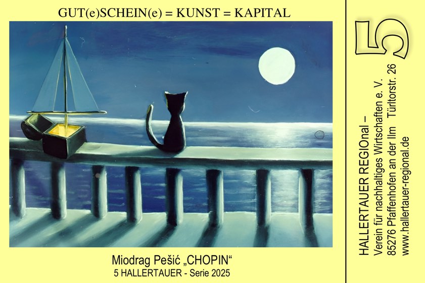 Wie der Verein weiter erklärt, sind aus dem Umtausch von Euro in "Hallertauer" im vergangenen Jahr – aufgestockt von Sitzungs-Geldern der örtlichen Wähler-Gruppe "Gemeinsam für Gemeinwohl" (GfG), für die Manfred "Mensch" Mayer im Pfaffenhofener Stadtrat sitzt – insgesamt 1000 Euro zusammengekommen. Mayer ist auch Vorsitzender des "Hallertauer Regional"-Vereins. Er sowie Hellmuth Inderwies, ehemaliger Kultur-Referent des Stadtrats von Pfaffenhofen, werden bei der Vernissage am morgigen Freitagabend in die Ausstellung in der städtischen Galerie einführen. Begrüßt werden die Gäste zuvor von Reinhard Haiplik, dem aktuellen Kultur-Referenten.