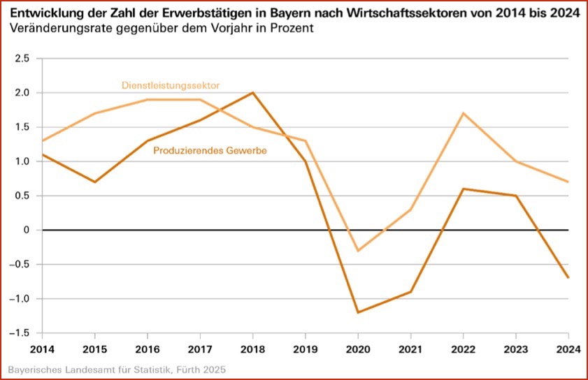 Die Erwerbstätigkeit entwickelte sich in den einzelnen Bereichen der Wirtschaft unterschiedlich. So ist der jüngste Zuwachs der Erwerbstätigkeit in Bayern auf ein weiteres Erstarken des Dienstleistungs-Sektors am Arbeitsmarkt zurückzuführen. Hier stiegen die Erwerbstätigen-Zahlen im vergangenen Jahr in Bayern um 0,7 Prozent auf 5,6 Millionen. Dagegen war die Beschäftigung im produzierenden Gewerbe – abgesehen vom Einbruch in den Corona- Jahren – zum ersten Mal seit 2003 wieder rückläufig: Etwa 14 600 Personen weniger als im Vorjahr waren 2024 in den produzierenden Wirtschafts-Bereichen erwerbstätig. Das entspricht einem Rückgang von 0,7 Prozent.