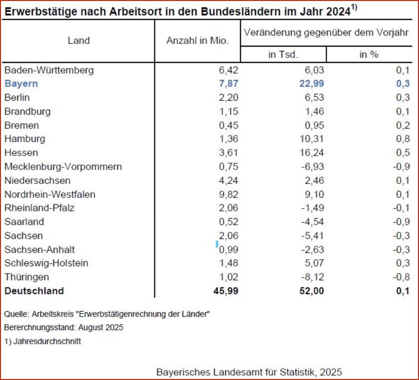 Mit diesem Zuwachs liegt Bayern gemeinsam mit Berlin und Schleswig-Holstein, die ebenfalls ein Wachstum von 0,3 Prozent verzeichnen konnten, über dem deutschlandweiten Anstieg von 0,1 Prozent. Lediglich in Hessen (plus 0,5 Prozent) und Hamburg (plus 0,8 Prozent) nahm die Beschäftigung noch stärker zu. Demgegenüber waren sieben Bundesländer von einem Beschäftigten-Rückgang betroffen. Am deutlichsten fiel dieser mit einem Minus von 0,9 Prozent in Mecklenburg-Vorpommern und im Saarland aus.