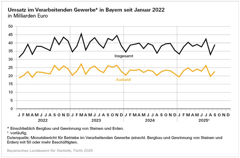 (ty) In den ersten neun Monaten des laufenden Jahres hat das verarbeitende Gewerbe im Freistaat einen Umsatz-Zuwachs von nominal 0,4 Prozent gegenüber dem Vorjahres-Zeitraum verbucht – und zwar auf rund 349,5 Milliarden Euro. Das wurde jetzt aus dem bayerischen Landesamt für Statistik gemeldet. Das verarbeitende Gewerbe, bezogen auf Betriebe mit 50 oder mehr Beschäftigten, umfasst dabei auch immer den Bergbau sowie die Gewinnung von Steinen und Erden.