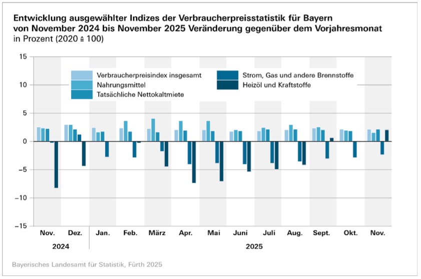 (ty) Im Freistaat sind die Verbraucher-Preise im zu Ende gehenden November gegenüber dem Vorjahres-Monat um 2,2 Prozent gestiegen. Das wurde am heutigen Freitag aus dem bayerischen Landesamt für Statistik gemeldet. Den Angaben zufolge kosten Nahrungsmittel 1,6 Prozent mehr als vor einem Jahr; Energie kann hingegen um 0,7 Prozent günstiger bezogen werden. Im Vergleich zum Vormonat Oktober sanken die Verbraucher-Preise um 0,2 Prozent. Nachfolgend weitere Details – auch zu einzelnen Waren – sowie zwei Grafiken.