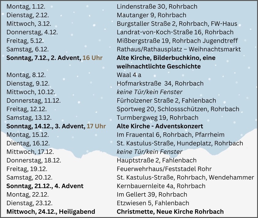 Bereits zu einer schönen Tradition geworden ist der "Lebendige Adventskalender" in Rohrbach. Auch dieses Jahr habe es der Dritte Bürgermeister Hans Vachal wieder geschafft, genügend Mitstreiter für diese Gemeinschafts-Aktion zu finden, heißt es aus der Gemeinde-Verwaltung. An fast allen Tagen in der Adventszeit könne man im Gemeinde-Bereich wieder geschmückte Türen oder Fenster finden, die sich ab 1. Dezember in der Regel jeweils um 18 Uhr öffnen. Dahinter befinde sich dann immer eine kleine Überraschung. Ob es Süßigkeiten für die Kinder, einen Ratsch bei Glühwein, eine Weihnachts-Geschichte, ein gemeinsames Singen und Musizieren oder etwas anderes gebe, das zeige sich erst, wenn es es soweit sei.