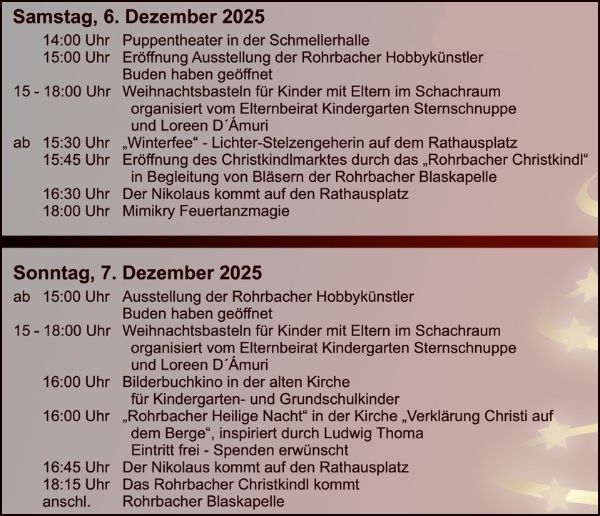 Der Christkindlmarkt findet am nächsten Wochenende statt. Er beginnt am Samstag um 14 Uhr mit einem Puppen-Theater in der Schmeller-Halle. Ab 15 Uhr haben die Buden geöffnet, zugleich starten die Ausstellung der örtlichen Hobby-Künstler und das Bastel-Angebot für Kinder. Offiziell eröffnet wird der Markt um 15.45 Uhr vom "Rohrbacher Christkindl" in Begleitung der hiesigen Blaskapelle. Der Nikolaus kommt um 16.30 Uhr auf den Rathausplatz und ab 18 Uhr steht "Feuertanz-Magie" auf dem Programm. Am Sonntag, 7. Dezember, starten der Christkindlmarkt, das Basteln für Kinder und die Ausstellung ebenfalls um 15 Uhr. Um 16 Uhr gibt es ein "Bilderbuch-Kino" in der alten Kirche, um 16.45 Uhr kommt der Nikolaus wieder auf den Rathausplatz und für 18.15 Uhr hat sich das Christkindl angekündigt. Danach spielt die Blaskapelle auf. Hier das Programm im Überblick: