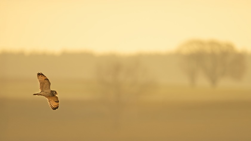 "Jedes Jahr bekommen wir sehr seltenen Besuch aus den hohen nordischen Ländern von Sumpfohreulen, welche bei uns in der Gegend überwintern", berichtet Schaaf. "Da sie Jahr für Jahr an einer anderen Stellen absteigen, ist die Suche immer aufwändig. Dazu kommt, dass die Sumpfohreulen getarnt im Gras sitzen und nur sehr selten fliegen." Für diese Aufnahme war er nach eigenem Bekunden fünf Tage lang vor Ort und hat darauf gewartet, dass eine Sumpfohreule aufsteigt. Ab und an habe er zwar ein Tier weit entfernt fliegen gesehen, aber keine Chance für eine gute Aufnahme gehabt. "Am fünften Tag war es dann endlich soweit und ich konnte in einer akzeptablen Entfernung vier Sumpfohreulen im Flug beobachten und einige schöne Aufnahmen bei Sonnenaufgang machen."