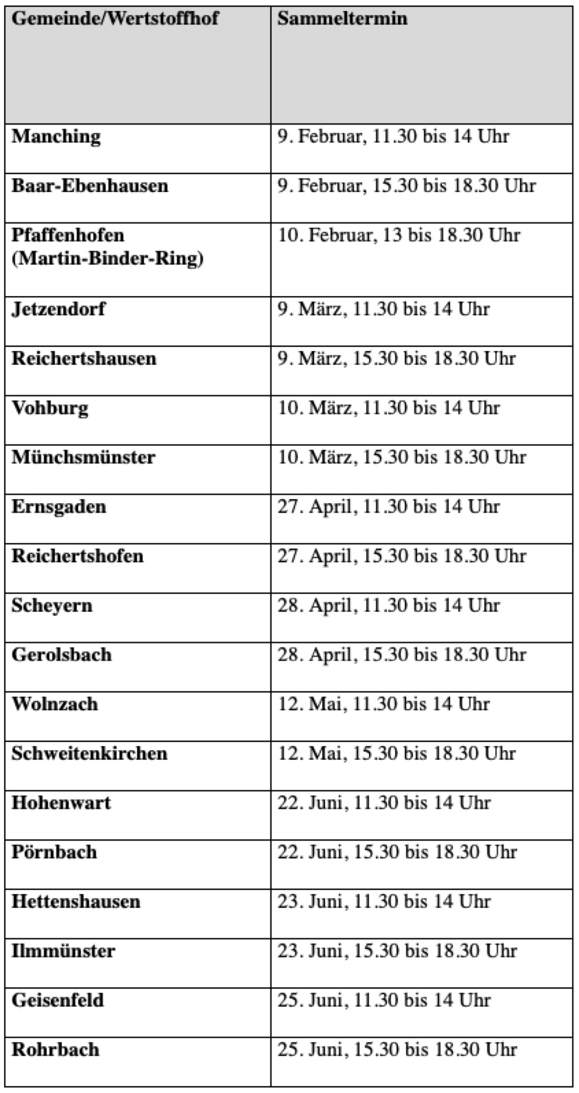 (ty) Der Abfall-Wirtschafts-Betrieb des Landkreises Pfaffenhofen (AWP) hat die Termine für die kostenlosen Problem-Abfall-Sammlungen bekannt gegeben, die heuer im ersten Halbjahr in den einzelnen Gemeinden angeboten werden. Eine detaillierte Übersicht finden Sie am Ende dieses Beitrags. Zudem gibt das Kommunal-Unternehmen erneut wichtige Hinweise zum Umgang mit speziellen Stoffen und erklärt, was im Rahmen der Sonder-Termine an den Wertstoffhöfen angenommen wird.