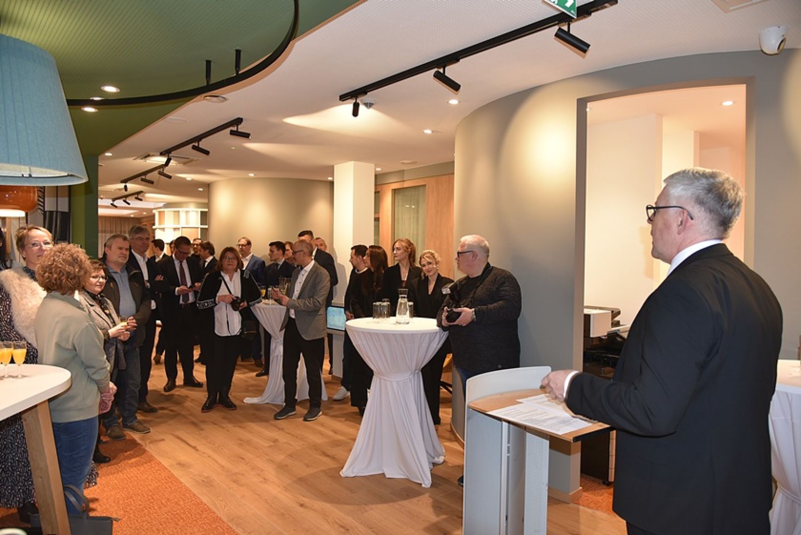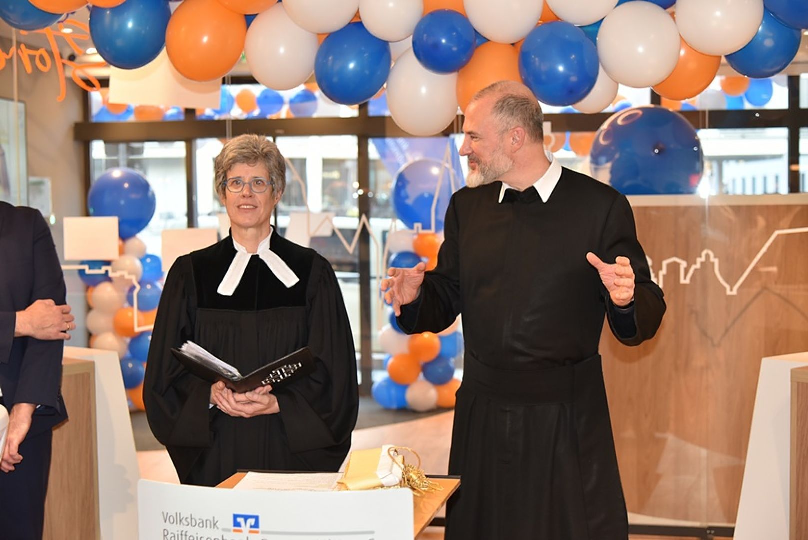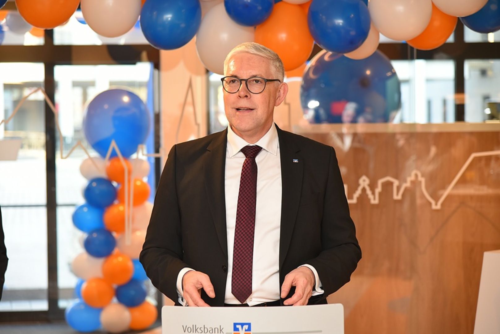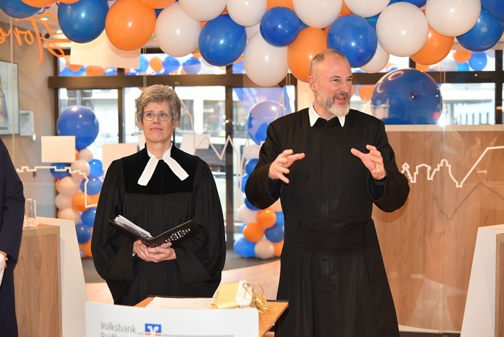 Vorstands-Mitglied Helmut Kundinger begrüßte bei der Feier zur offiziellen Eröffnung die geladenen Besucher und bedankte sich für die zahlreiche Teilnahme. Unter den Ehrengästen befanden sich neben weiteren Vertreterinnen und Vertretern des Geldinstituts auch Professor Georg Rosenfeld, der Wirtschafts-Referent der Stadt Ingolstadt, sowie die evangelische Pfarrerin Maren Michaelis, der katholische Pater Ralph Heiligtag und zahlreiche Mitarbeiter der Volksbank-Raiffeisenbank Bayern-Mitte.