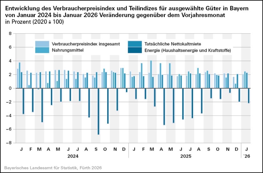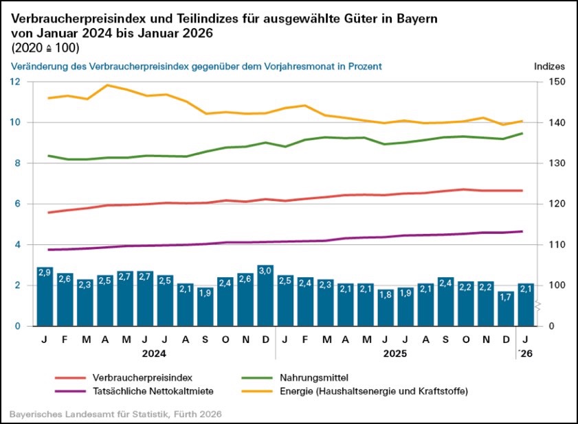 (ty) Im Freistaat sind die Verbraucher-Preise im zu Ende gehenden Januar gegenüber dem Vorjahres-Monat um 2,1 Prozent gestiegen. Das wurde am heutigen Freitag aus dem bayerischen Landesamt für Statistik bekannt gegeben. Den Angaben zufolge kosten Nahrungsmittel aktuell 2,5 Prozent mehr als vor einem Jahr, Energie kann hingegen um 2,2 Prozent günstiger bezogen werden. Im Vergleich zum Vormonat Dezember blieb der Verbraucher-Preis-Index erneut unverändert. Nachfolgend weitere Details – auch zu einzelnen Waren – sowie zwei Grafiken.
