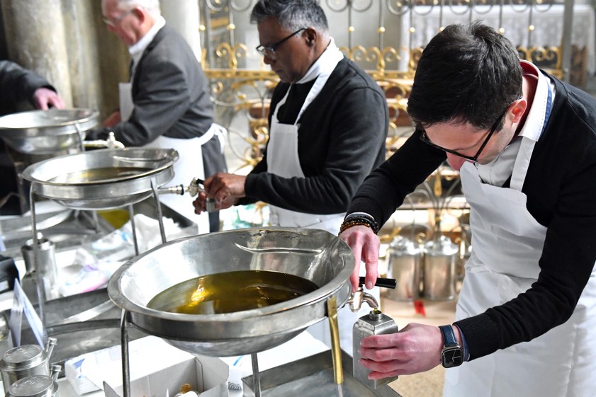 Auf die Predigt folgte die Erneuerung der Bereitschaft zum priesterlichen Dienst und die Weihe der heiligen Öle. In einer feierlichen Prozession unter den Klängen des Heilig-Geist-Hymnus wurden diese in großen Gefäßen in den Altarraum getragen: Das Katechumenenöl brachten Mitglieder des Ritterordens vom Heiligen Grab zu Jerusalem zum Altar, das Krankenöl Mitarbeiterinnen und Mitarbeiter der Klinik-Seelsorge und das Chrisamöl schließlich zwei ständige Diakone. Nach dem Gottesdienst wurden die drei heiligen Öle, insgesamt waren es nach Angaben der Diözese 100 Liter, in kleinere Behälter abgefüllt, versiegelt und an Frauen und Männer aus den einzelnen Dekanaten verteilt.