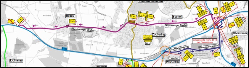 Während der Sperrung werden laut staatlichem Bauamt folgende Umleitungen eingerichtet: Der von der Autobahn A9 beziehungsweise von Manching her kommende Verkehr werde über die B13 nach Zuchering und Hagau sowie dort wieder auf die B16 geleitet. Der von Neuburg an der Donau her kommende Verkehr werde über das Gewerbe-Gebiet "Weiherfeld" beziehungsweise die Immelmannstraße auf die B13 und weiter auf die B16 in Richtung A9 beziehungsweise Manching geführt. Die Behörde spricht von "dringend erforderlichen Arbeiten" und betont: "Witterungsbedingte Verschiebungen können nicht ausgeschlossen werden."
