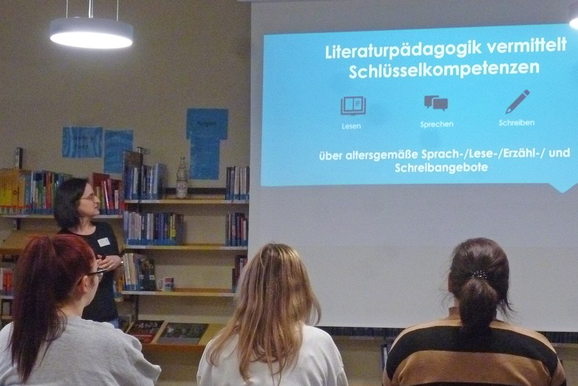 Bücherei-Mitarbeiterin Elisabeth Brendel, die aktuell ihre Qualifizierung zur Literatur-Pädagogin abschließt, führte durch den Nachmittag. Sie stellte zentrale Inhalte und Ziele der Literatur-Pädagogik vor und zeigte anhand konkreter Beispiele, wie sich Sprösslinge im Alter von ein bis zwölf Jahren für Geschichten und Sprache begeistern lassen. Die angehenden Kinderpflegerinnen probierten die Methoden direkt aus: Sie schlüpften in die Rolle von Kleinkindern und nahmen an einer interaktiven Bilderbuch-Betrachtung teil. Anschließend spielten sie die Geschichte gemeinsam mit einer Handpuppe nach.