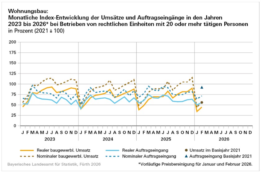 Im Wohnungsbau zeigten die preisbereinigten Daten den deutlichen Rückgang dieser Bausparte: Die Aufträge lagen real 36,9 Prozentpunkte unter dem Monatswert des Jahres 2021, die Umsätze um 11,1 Prozentpunkte darunter. Im Vergleich zum Vorjahr zeigte sich eine Abnahme sowohl beim nominalen Umsatz (minus 3,8 Prozentpunkte) als auch beim realen Umsatz (minus 3,6 Prozentpunkte). Die Auftrags-Eingänge verzeichneten nominal sowie real einen Rückgang um 4,9 Prozentpunkte beziehungsweise 4,6 Prozentpunkte. Mit Blick auf die Sparten übertraf der Tiefbau den Hoch- und Wohnungsbau auch im Februar dieses Jahres beim Auftrags-Eingang deutlich. "Vor allem Projekte im Bereich der Energie- und Verkehrs-Infrastruktur stützten die Gesamt-Entwicklung des bayerischen Bauhauptgewerbes", so das Landesamt für Statistik.