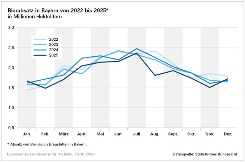 Über das gesamte vergangene Jahr betrachtet, war der höchste Bierabsatz der bayerischen Brauereien in den Monaten Mai (2,1 Millionen Hektoliter), Juni (2,2 Millionen Hektoliter) und Juli (2,4 Millionen Hektoliter) zu verzeichnen. Die stärksten Zunahmen im Bierabsatz des Jahres 2025 verglichen mit dem jeweiligen Vorjahres-Monat wiesen die Monate Januar (plus 2,8 Prozent) und Dezember (plus 2,6 Prozent) auf.