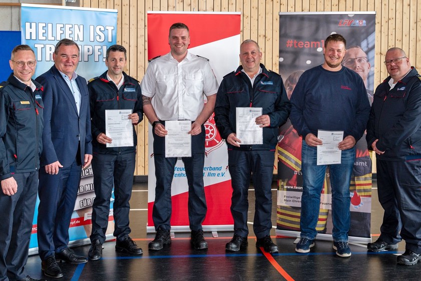 Roland Müller zum "Örtlichen Einsatz-Leiter" vorabbenannt. Neue Aufgaben-Gebiete für die Kreisbrandmeister Engelbert Krammer, Florian Brecko und Kareem Zell.