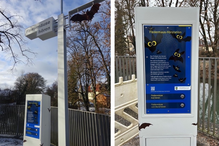 Neues Angebot auf Höhe der Fußgänger-Brücke über die Ilm bei den Treppen-Stufen zum Ufer. Wenn gerade keine Tiere in der Nähe sind, können typische Rufe vom Band abgespielt werden.