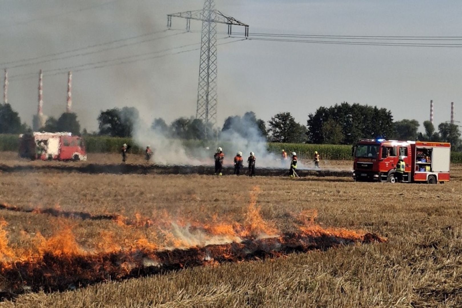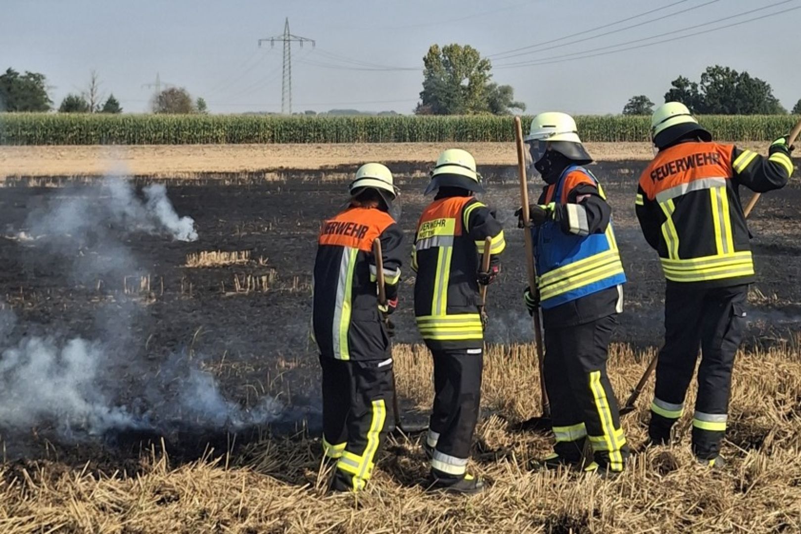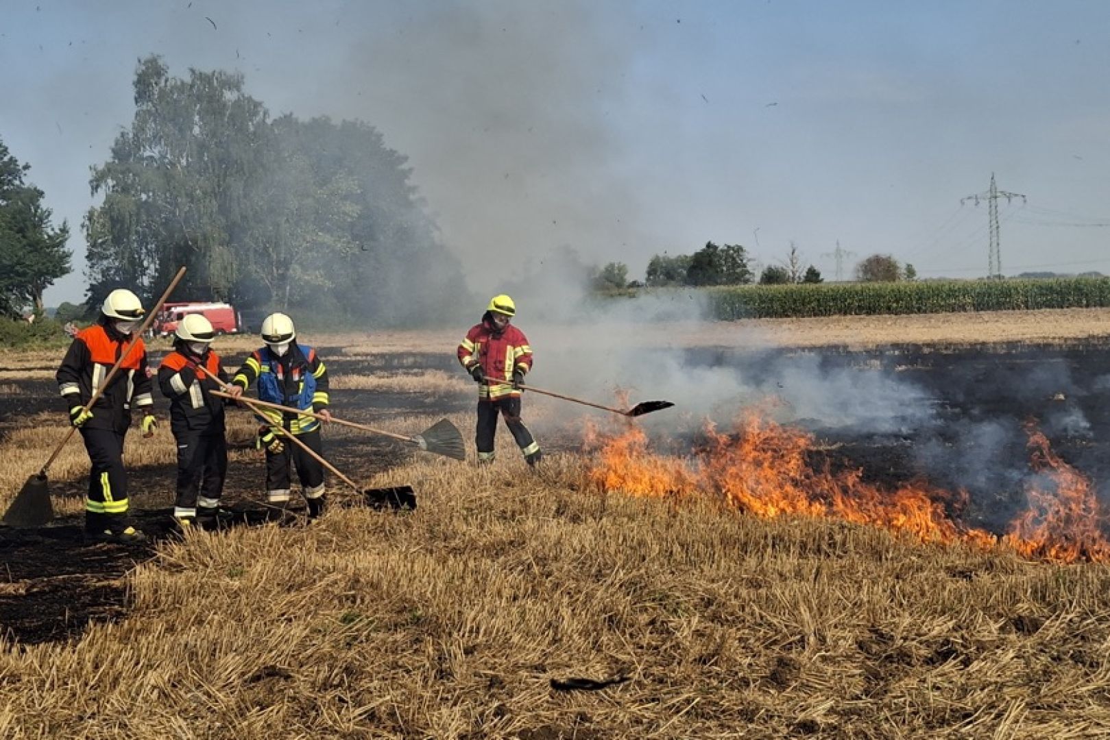 Stoppelfeld als Trainings-Areal. Floriansjünger nutzten verschiedene Techniken. Fokus lag auf überörtlicher Kooperation und Einbindung der Landwirte.