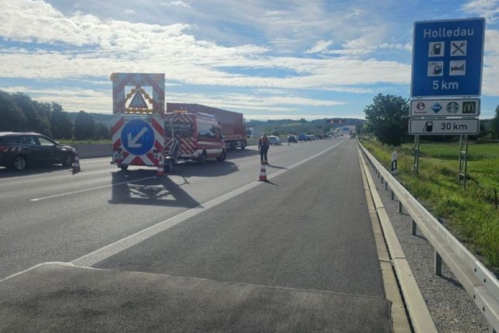 Während der Lösch-Maßnahmen durch die Feuerwehr aus Langenbruck und Baar sei die A9 in Fahrtrichtung München für zirka eine halbe Stunde komplett gesperrt gewesen, so eine Polizei-Sprecherin. Der Verkehr staute sich daraufhin ihren Worten zufolge auf bis zu zehn Kilometern zurück. Der Mercedes sei komplett ausgebrannt. Der Sachschaden wurde von Streifenbeamten auf 7000 Euro geschätzt. Für die Bergung des Wracks sei ein Abschleppdienst gerufen worden.
