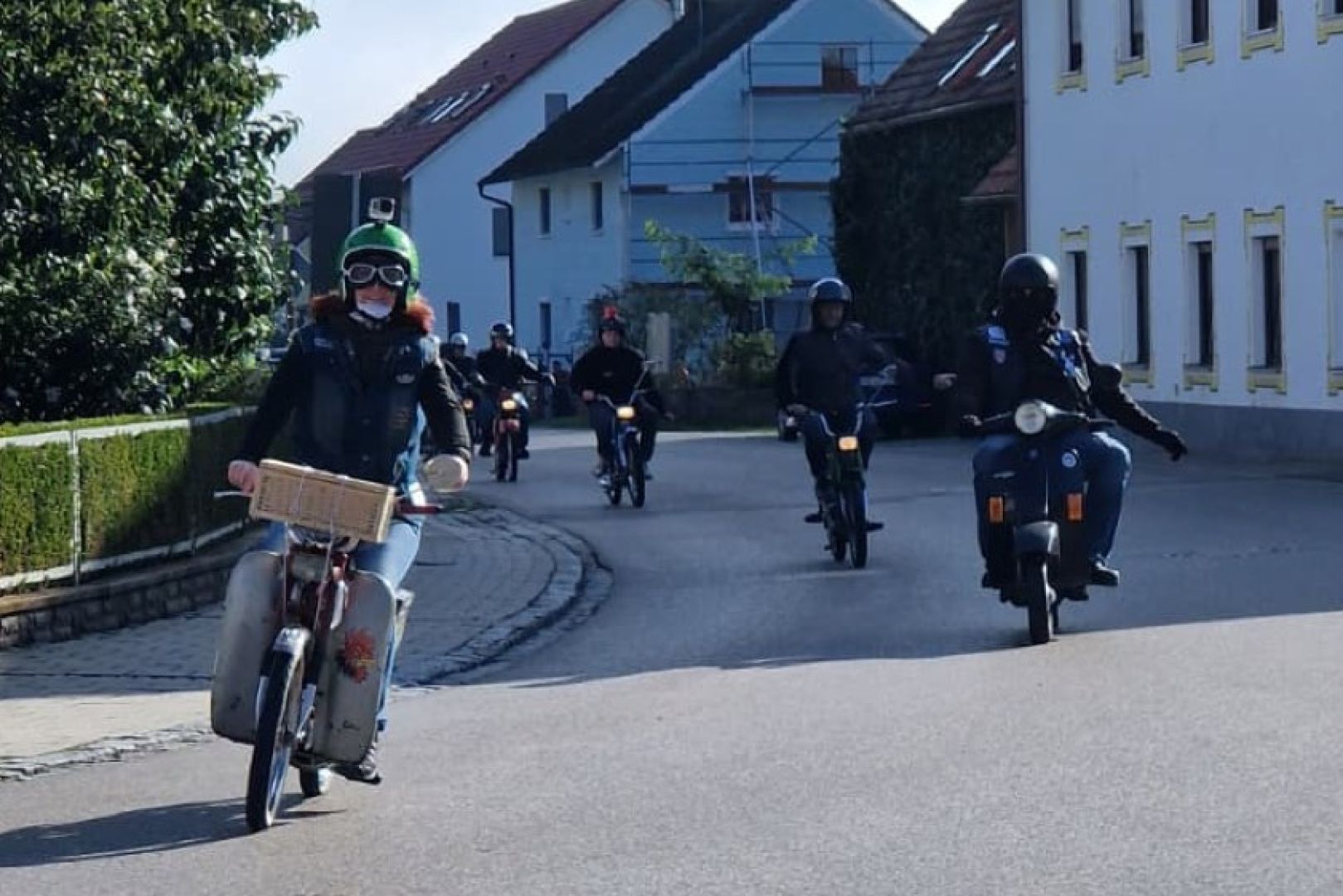 (ty) Ein besonderer Ausflug hat die "Zwoa-Takt-Schnecken" aus Hettenshausen am gestrigen Samstag gemeinsam mit den "Bembegga Henasprenga" aus Pörnbach zu den befreundeten "Schluchtenflitzern" nach Schrobenhausen geführt (Fotos). Im Nachbar-Landkreis stieg nämlich die 17. Auflage des weithin bekannten Schluchtenflitzer-Treffens. Um die 800 Mofas und Mopeds verschiedener Marken gab es dort zu sehen – viele Oldtimer und rollende Raritäten. Für die beiden Gruppen aus dem Kreis Pfaffenhofen begann der Tag traditionsgemäß: Die Hettenshausener steuerten erst einmal nach Pörnbach, gemeinsam stärkte man sich bei einem Weißwurst-Frühstück und besprach die anstehende Route.