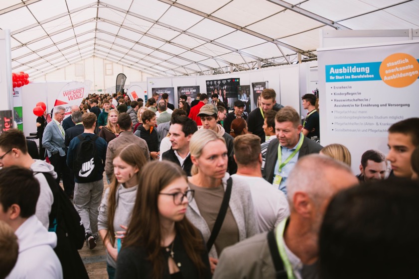 "Ein klarer Blick auf die eigenen Stärken und Ziele erleichtert den Start ins Berufsleben", unterstreicht das KUS. Wie wichtig eine frühzeitige Orientierung dabei sei, habe die fünfte Auflage der zentralen Ausbildungs-Messe gezeigt. Das Event stieg diesmal an besonderer Stelle: "Noch wenige Tage zuvor wurde im Festzelt Volksfest gefeiert, ehe 35 Stunden Aufbauzeit, 268 helfende Hände, 395 Meter Messewände und 1005 Quadratmeter Teppichboden die Halle in eine Messewelt verwandelten", so das KUS. "Am Ende boten den Angaben zufolge dann 2030 Quadratmeter Ausstellungsfläche in der Halle und weitere 300 Quadratmeter im Freigelände viel Raum für den Austausch zwischen den Besuchern und den Firmen-Vertretern.