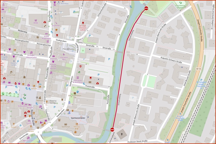 Im genannten Zeitraum werde der Ilmweg im Abschnitt zwischen dem "Moosburger Hof" und dem Bürgerpark (siehe Karte) ganztägig für den Durchgangs-Verkehr gesperrt. Diese Baumpflege-Arbeiten seien wegen festgestellter Mängel nötig – zum Beispiel abgestorbene Äste. Spaziergänger und Radler werden ausdrücklich darum gebeten, den genannten Bereich während der Sperrungen zu umgehen beziehungsweise zu umfahren. (Karte: Stadtwerke Pfaffenhofen)