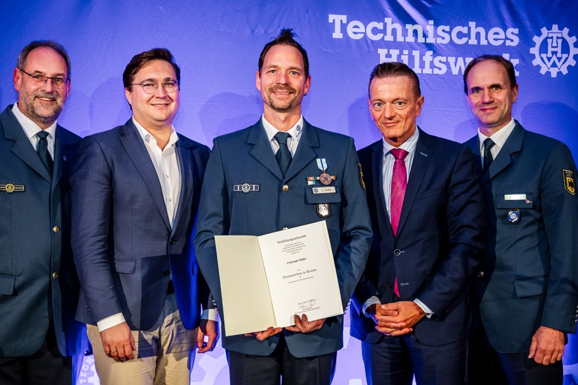 Ein Höhepunkt der Zusammenkunft war die Auszeichnung von Schirrmeister Christoph Müller mit dem bronzenen THW-Ehrenzeichen. Müller, der seit 2001 im Ortsverband aktiv ist, engagiere sich seit vielen Jahren auf vielfältige Weise – als Ausbilder, Prüfer, Auslands-Experte und bei Hochwasser-Einsätzen sowie durch sein unermüdliches Engagement in den Bereichen Technik und Ausbildung. Christoph Müllers Einsatz stehe stellvertretend für das, was das THW und die Gesellschaft trage, betonte Klaus Labitzke, der Leiter der THW-Regionalstelle, in seiner Ansprache: "unermüdliches ehrenamtliches Engagement für den Schutz anderer".