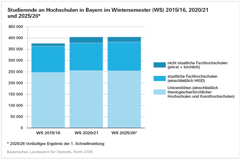Im Zehnjahres-Vergleich nimmt die Zahl der Studierenden in Bayern seit dem Winter-Semester 2015/16 (376 488 Studierende) um insgesamt 7,6 Prozent zu. Dabei stieg die Frauen-Quote um 1,24 Prozentpunkte auf 49,8 Prozent im Winter-Semester 2025/26. Im Vergleich zwischen dem aktuellen Semester und dem Winter-Semester 2015/16 weisen die Universitäten einen Anstieg der Studierenden-Zahlen von 2,5 Prozent auf, das ist ein Plus von 6155 Studierenden. Bei den Fachhochschulen (inklusive der Hochschulen für den öffentlichen Dienst) ist ein Plus von 17,0 Prozent zu verzeichnen, dies entspricht 22 020 Studierenden mehr.