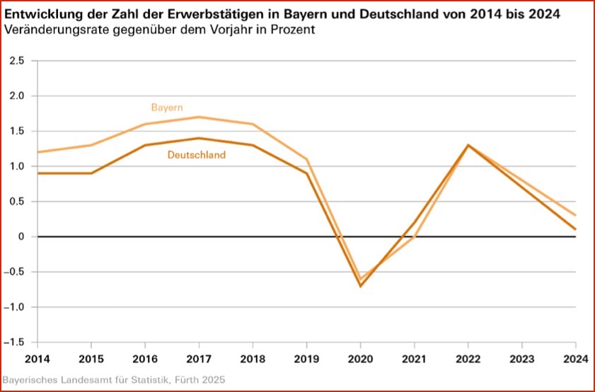 (ty) Die jüngsten vom Arbeitskreis "Erwerbstätigen-Rechnung der Länder" veröffentlichten Berechnungen der Erwerbstätigen-Zahlen zeigen für Bayern einen weiteren Anstieg. Dieser fällt jedoch mit 0,3 Prozent für das vergangene Jahr etwas moderater aus als in den beiden Vorjahren, in denen die Erwerbstätigen-Zahlen noch mit Veränderungsraten von 1,3 Prozent (2022) und 0,8 Prozent (2023) gewachsen waren. Durchschnittlich 7,87 Millionen Personen übten den Angaben zufolge im Freistaat im vergangenen Jahr eine auf Erwerb ausgerichtete Tätigkeit aus. Das waren knapp 23 000 mehr als im Jahr zuvor.