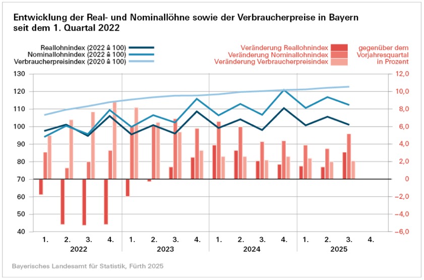 (ty) Die nominalen Verdienste der Arbeitnehmerinnen und Arbeitnehmer im Freistaat sind im dritten Quartal heuer um durchschnittlich 5,2 Prozent gegenüber dem Vorjahres-Quartal gestiegen. Die Verbraucher-Preise nahmen nach Angaben des bayerischen Landesamts für Statistik im dritten Quartal dieses Jahres um 2,1 Prozent gegenüber dem Vorjahres-Zeitraum zu. Somit erhöhte sich die realen (preisbereinigten) Brutto-Monatsverdienste einschließlich Sonder-Zahlungen aller Arbeitnehmerinnen und Arbeitnehmer im selben Zeitraum durchschnittlich um 3,1 Prozent. Damit fiel die Reallohn-Steigerung höher aus als in den ersten beiden Quartalen dieses Jahres.
