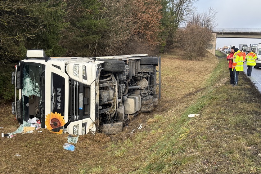 Laut Polizei geriet der Lkw heute Vormittag langsam von der Strecke und kippte im Grünstreifen um. Verkehrs-Behinderungen und Stau in Richtung Süden.