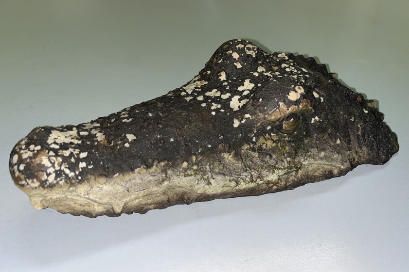 Nach Angaben der Polizei stellte sich schließlich heraus, dass es sich "um die täuschend echte, 30 Zentimeter lange Attrappe eines Krokodil- beziehungsweise Alligator-Kopfes" handele (Foto unten). Diese sei freilich sichergestellt worden, erklärt ein Polizei-Sprecher – "um einerseits weitere Mitteilungen besorgter Bürger zu verhindern und andererseits den Eigentümer der Attrappe zu ermitteln". Hinweise diesbezüglich nimmt die Polizei-Dienststelle in der Kreisstadt jederzeit telefonisch unter der Rufnummer (0 84 41) 80 95 0 entgegen.