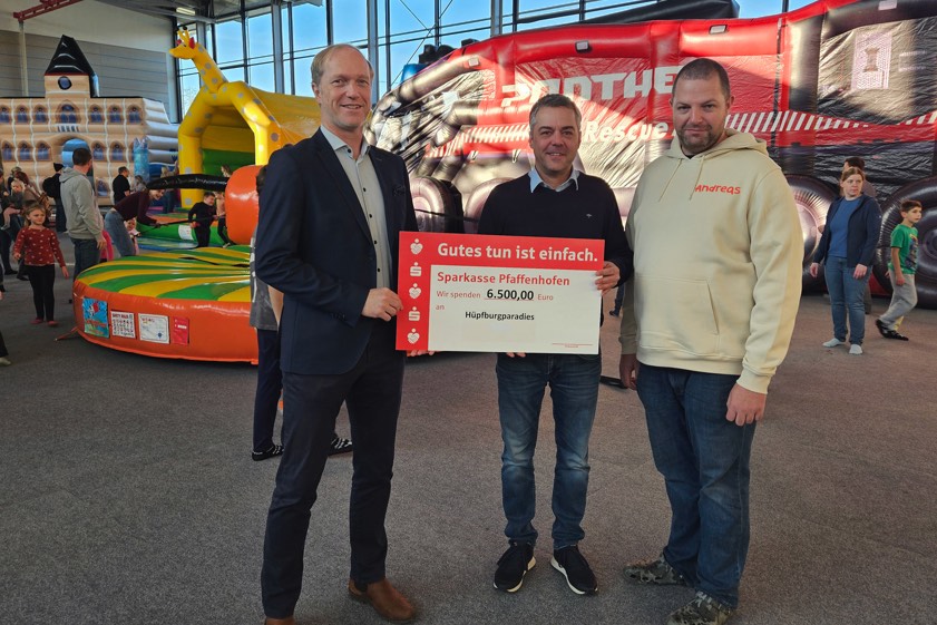 Tino Müller, Vorstands-Vorsitzender der Sparkasse von Pfaffenhofen, überreichte laut Stadtverwaltung anlässlich der Eröffnung des Hüpfburgen-Paradieses am Samstag einen symbolischen Spenden-Scheck über 6500 Euro an Bürgermeister Thomas Herker (SPD). Der Rathaus-Chef bedankte sich den Angaben zufolge für die großzügige finanzielle Unterstützung und richtete seinen Dank für die fantasievollen Spielgeräte ebenfalls an die Hüpfburg-Verleih-Firma "Springhelden-Welt by Eder", die dieses Jahr zum ersten Mal das Event ausstattet.