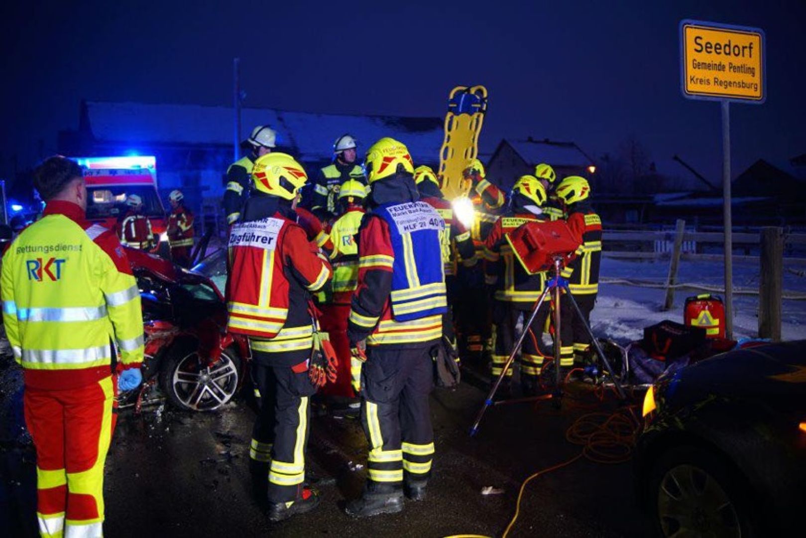 Laut Polizei war der 40 Jahre alte Rumäne mit seinem Auto auf der Kreisstraße R4 – von Bad Abbach her kommend – in Richtung Seedorf unterwegs. In der Ortschaft sei er mit seinem Pkw nach rechts von der Strecke geraten und habe zirka 100 Meter im gefrorenen Grünstreifen zurückgelegt; dabei sei auch der Zaun einer Pferdekoppel ramponiert worden. Bei dem Versuch, seinen Wagen wieder auf die Fahrbahn zu steuern, sei dieser auf die Gegenspur geraten und frontal mit dem entgegenkommenden Kleintransporter zusammenstoßen, in dem sich die beiden Deutschen befanden. Durch die Wucht des Aufpralls sei der Unfall-Verursacher schwer verletzt und in seinem Wrack eingeklemmt worden.