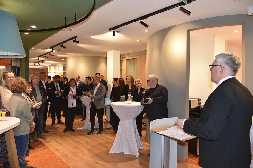 Vorstands-Mitglied Helmut Kundinger begrüßte bei der Feier zur offiziellen Eröffnung die geladenen Besucher und bedankte sich für die zahlreiche Teilnahme. Unter den Ehrengästen befanden sich neben weiteren Vertreterinnen und Vertretern des Geldinstituts auch Professor Georg Rosenfeld, der Wirtschafts-Referent der Stadt Ingolstadt, sowie die evangelische Pfarrerin Maren Michaelis, der katholische Pater Ralph Heiligtag und zahlreiche Mitarbeiter der Volksbank-Raiffeisenbank Bayern-Mitte.