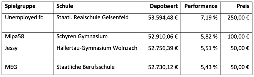 (ty) Die jüngste Auflage des "Planspiel Börse" ist kürzlich mit einem neuen Rekord zu ende gegangen. Wie die Sparkasse von Pfaffenhofen mitgeteilt hat, nahmen knapp 130 000 Schülerinnen und Schüler, Studierende und Auszubildende aus Europa teil. Sie sammelten in der knapp viermonatigen Spielzeit risikofrei Börsen-Erfahrung – mit fiktiven Depots, realen Kursen und verschiedenen Strategien. Aus dem Landkreis Pfaffenhofen beteiligten sich nach Angaben des Geldinstituts mehr als 120 junge Leute in 47 Teams aus sechs verschiedenen Schulen. Nachfolgend die Details sowie die Platzierungen.