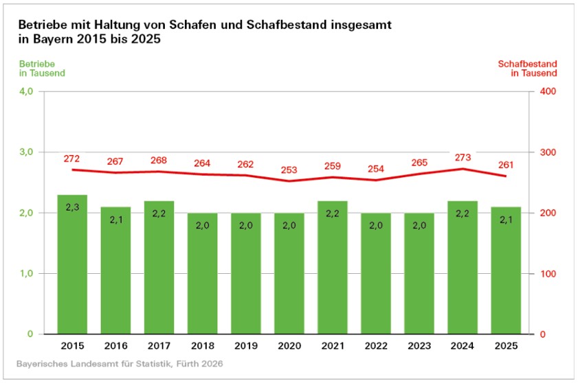 Im Verlauf der vergangenen zehn Jahre unterlagen in Bayern sowohl der Schaf-Bestand als auch die Zahl der schafhaltenden Betriebe immer wieder leichten Schwankungen. Im direkten Vergleich der Jahre 2015 und 2025 lag der Schafbestand mit 260 700 Tieren im vergangenen Jahr um 4,0 Prozent unter dem Bestand des Jahres 2015, die Zahl der schafhaltenden Betriebe nahm um 6,0 Prozent ab.