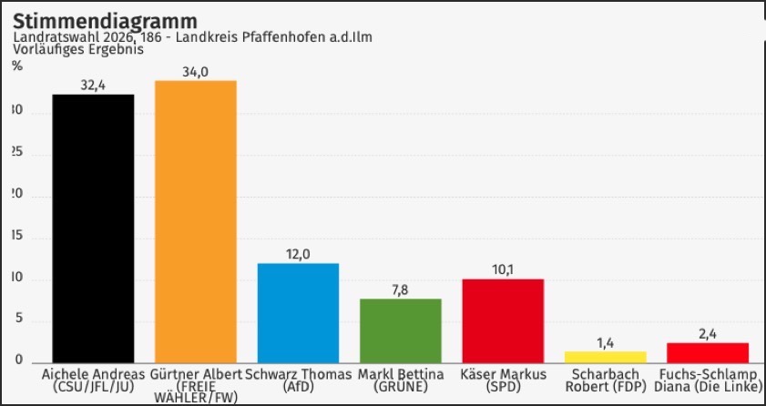 Der Amtsinhaber von den Freien Wählern holte heute 34,0 Prozent – knapp dahinter landete der CSU-Kandidat mit 32,4 Prozent.