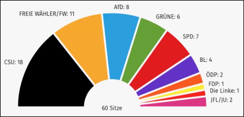 AfD erringt etliche Mandate dazu, alle anderen Fraktionen büßen je einen Sitz ein, CSU bleibt klar stärkste Riege, JFL/JU und Linke ziehen neu ins Gremium ein.
