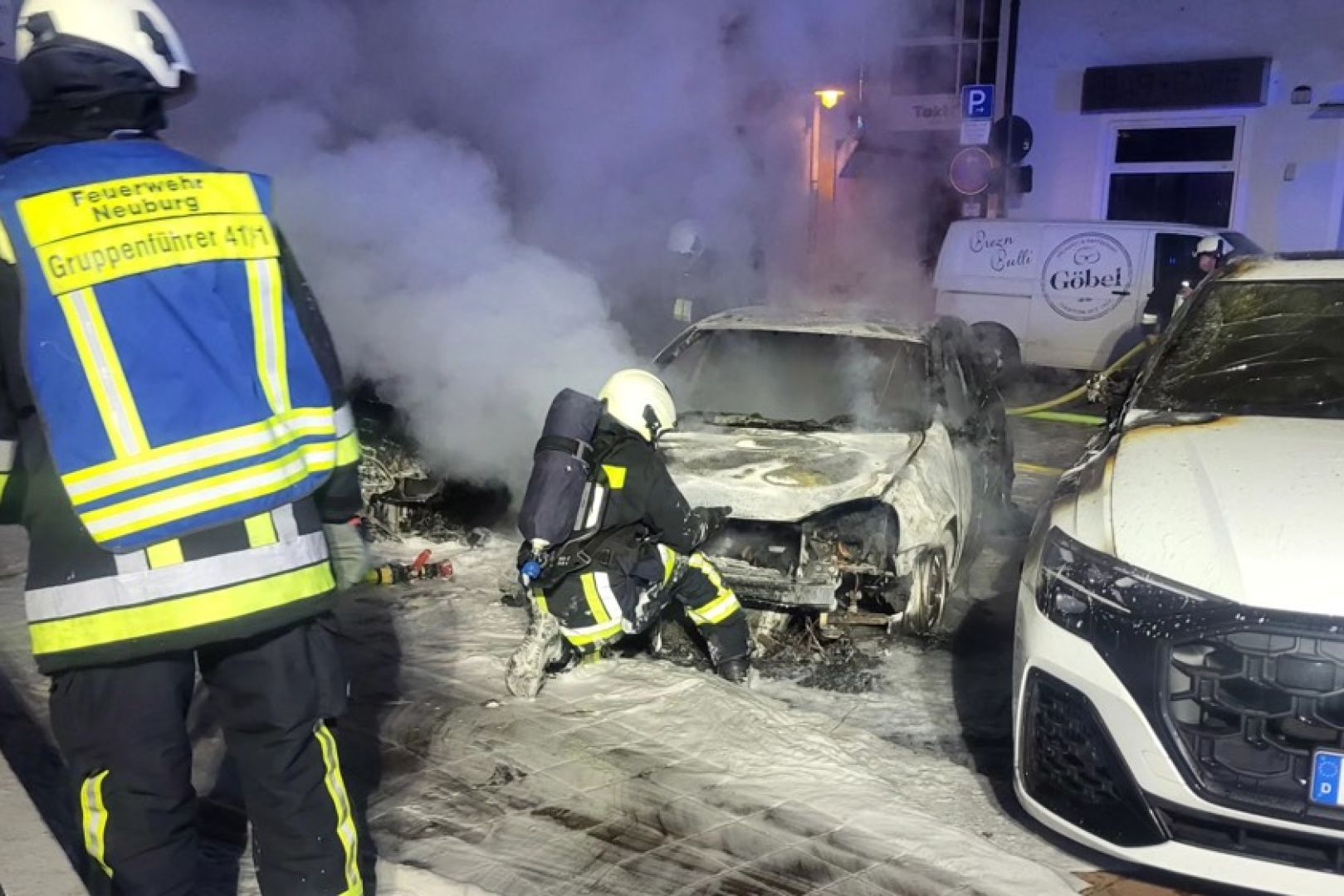 Gegen 3.30 Uhr seien Polizei und Feuerwehr von Zeugen über einen am Bürgermeister-Hocheder-Platz brennenden VW-Golf informiert worden. Die Flammen griffen den Angaben zufolge dann auf zwei daneben stehende Autos über. Dabei handele es sich um einen Ford-Focus und um einen Audi-Q8. Eine noch weitere Ausbreitung des Brandes habe durch die Lösch-Maßnahmen der örtlichen Feuerwehr verhindert werden können. Nach Angaben der Floriansjünger brannten die drei Pkw vollständig aus und mussten schließlich abgeschleppt werden.