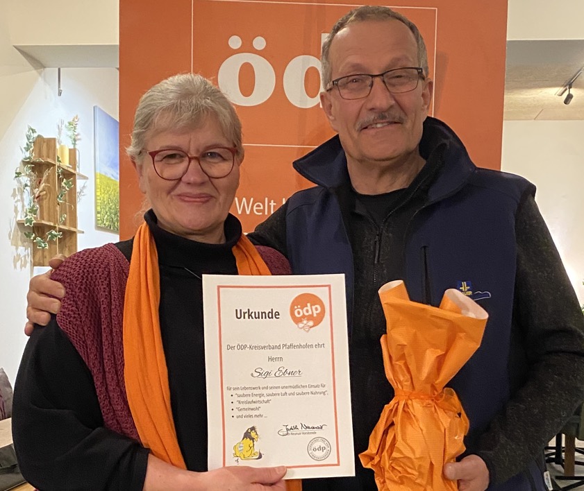 Die alte und neue ÖDP-Kreisvorsitzende Judith Neumair überreichte Sigi Ebner ein kleines Präsent und eine Urkunde für 40 Jahre unermüdlichen Einsatz für saubere Energie, Kreislaufwirtschaft und Gemeinwohl.