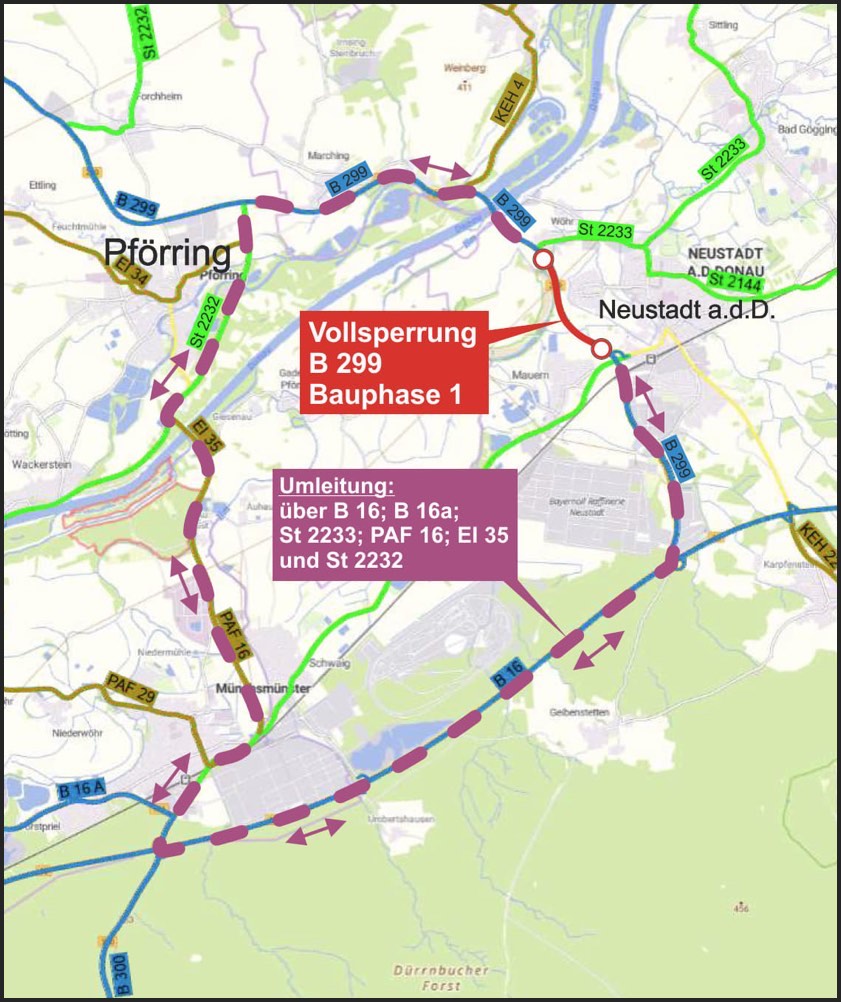 In den angrenzenden Straßen-Abschnitten sei die Fahrbahn bereits in zurückliegenden Jahren erneuert worden. Die Kosten für die nun bevorstehenden Arbeiten zwischen Mauern und Wöhr belaufen sich laut Angaben des staatlichen Bauamts von Landshut auf rund eine Million Euro. Die Umleitung erfolge während der B299-Vollsperrung über die Bundesstraße B16, die Bundesstraße B16a, die Staatsstraße 2233, die Kreisstraße PAF14, die Kreisstraße EI35 und die Staatsstraße 2232 beziehungsweise umgekehrt.