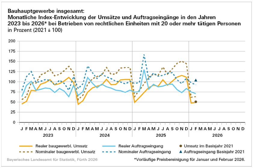 Die Auftrags-Eingänge im bayerischen Bauhauptgewerbe gingen im Februar um 6,0 Prozent zurück. Die größten absoluten Rückgänge lagen mit 61 Millionen Euro (minus 24,4 Prozent) im Bereich des Straßenbaus beziehungsweise mit 50 Millionen Euro (minus 13,9 Prozent) beim gewerblichen und industriellen Hochbau. Steigerungen um jeweils etwa 20 Millionen Euro gab es im öffentlichen Tiebau für Gebietskörperschaften und Sozialversicherungen (plus 11,8 Prozent) und im gewerblichen und industriellen Tiefbau (plus 6,3 Prozent). Im Hochbau verzeichneten mit Ausnahme des öffentlichen Hochbaus für Gebietskörperschaften und Sozialversicherungen (plus 4,0 Prozent) alle Bausparten abnehmende Auftrags-Vergaben. Die Spanne der relativen Rückgänge belief sich zwischen 6,4 Prozent im Wohnungsbau und 26,8 Prozent im öffentlichen Hochbau ohne Erwerbszweck.