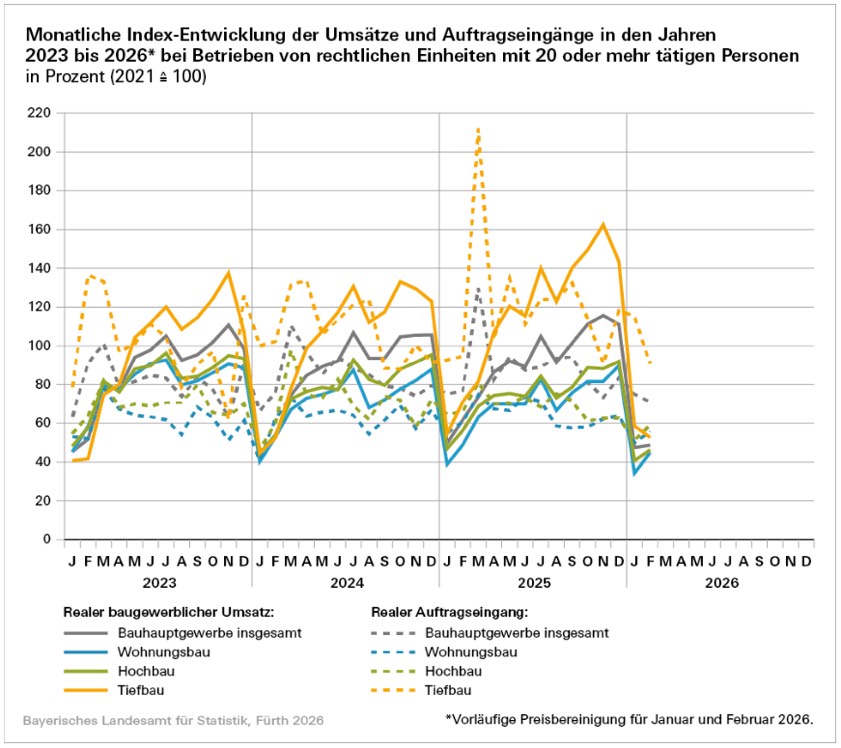 Im Wohnungsbau zeigten die preisbereinigten Daten den deutlichen Rückgang dieser Bausparte: Die Aufträge lagen real 36,9 Prozentpunkte unter dem Monatswert des Jahres 2021, die Umsätze um 11,1 Prozentpunkte darunter. Im Vergleich zum Vorjahr zeigte sich eine Abnahme sowohl beim nominalen Umsatz (minus 3,8 Prozentpunkte) als auch beim realen Umsatz (minus 3,6 Prozentpunkte). Die Auftrags-Eingänge verzeichneten nominal sowie real einen Rückgang um 4,9 Prozentpunkte beziehungsweise 4,6 Prozentpunkte. Mit Blick auf die Sparten übertraf der Tiefbau den Hoch- und Wohnungsbau auch im Februar dieses Jahres beim Auftrags-Eingang deutlich. "Vor allem Projekte im Bereich der Energie- und Verkehrs-Infrastruktur stützten die Gesamt-Entwicklung des bayerischen Bauhauptgewerbes", so das Landesamt für Statistik.